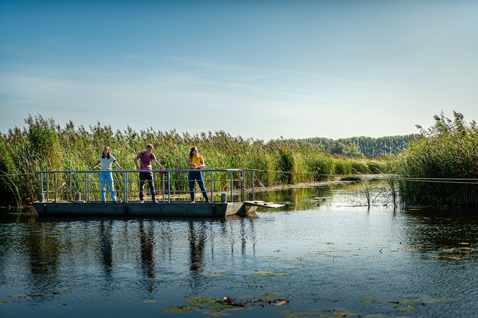 De laatste stop lag bij het Rijstrangenpad. Tussen hoge rietplanten leidde een paadje naar het trekpontje over de Oude Rijn. Het trekken aan het touw leverde niet alleen een overtocht op, maar ook sfeervolle beelden in het warme licht.